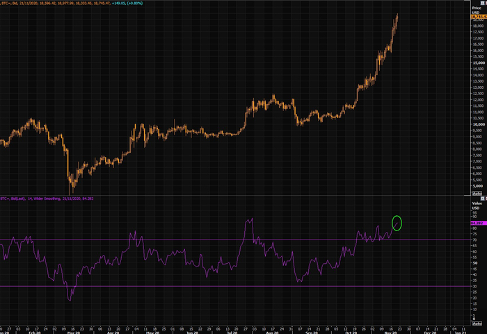 自10月以来,比特币一路上涨,从10000美元飙至19500美元,近乎翻倍。距2017年末的19783美元的历史峰值仅一步之遥。