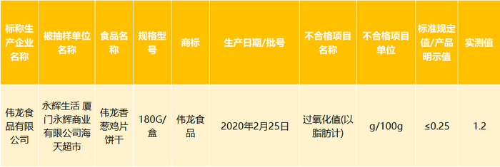 据厦门市市场监督管理局网站11月20日公布的2020年第16期食品抽检信息显示,永辉超市-厦门市海天店在永辉生活(手机APP)销售的、标称伟龙食品有限公司生产的“伟龙食品”伟龙香葱鸡片饼干(生产日期:2020年02月25日),经厦门海关技术中心检验发现,其中过氧化值(以脂肪计)检出值为1.2 g/100g,不符合食品安全国家标准规定的≤0.25g/100g。厦门永辉商业有限公司海天超市对检验结果提出异议,并申请复检,经福建省产品质量检验研究院检验后维持初检结论。