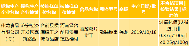 今年3月25日,河南省市场监督管理局网站公布的2020年第10期食品抽检信息显示,台前县侯庙镇千之味食品店销售的、标称伟龙食品有限公司生产的1批次香葱鸡片饼干,过氧化值(以脂肪计)检出值为0.37g/100g。