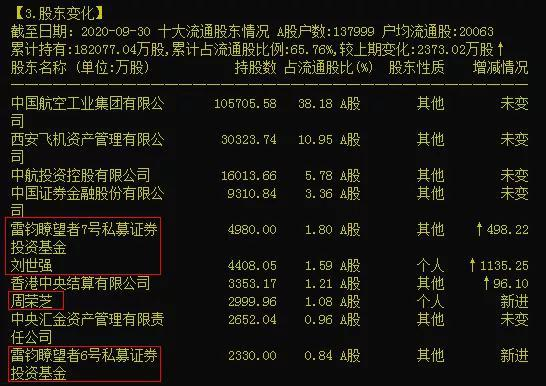 再来看看,今天的热点板块,军工板块无疑是最热的,里面的一只牛股,牛眼君算是错过了,只有看的份,那就是中航飞机,一直躺在自选股有几年时间。公司十大流通股东里面出现了超级牛散刘世强,这个人此前据说是干软件行业的,前几年介入的启明星辰、用友网络、中国软件均是大牛股,被市场称为“软件大亨”。里面的一家私募也有来头,雷钧瞭望者7号和雷钧瞭望者6号,是私募雷钧资产旗下的产品。还有牛散周荣芝。以下是中航飞机三季报的十大流通股东。