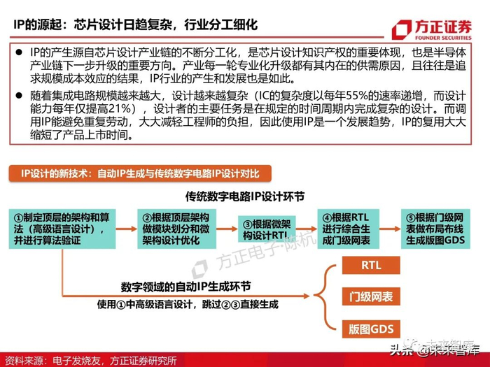 IP在芯片设计中的核心作用。芯片设计上游主要包括EDA和IP,EDA是作为芯片设计工具和辅助性软件,IP 作为芯片设计的“原材料”。总体而言,芯片设计即为通过选取符合要求并实现相关功能的IP,运用EDA工 具将程式码转换成实际的电路图。