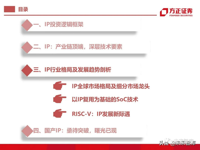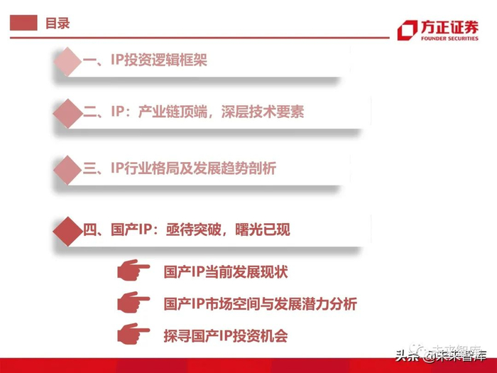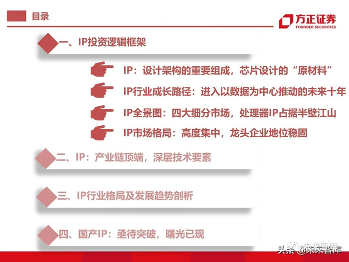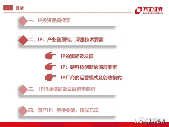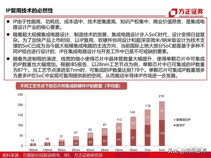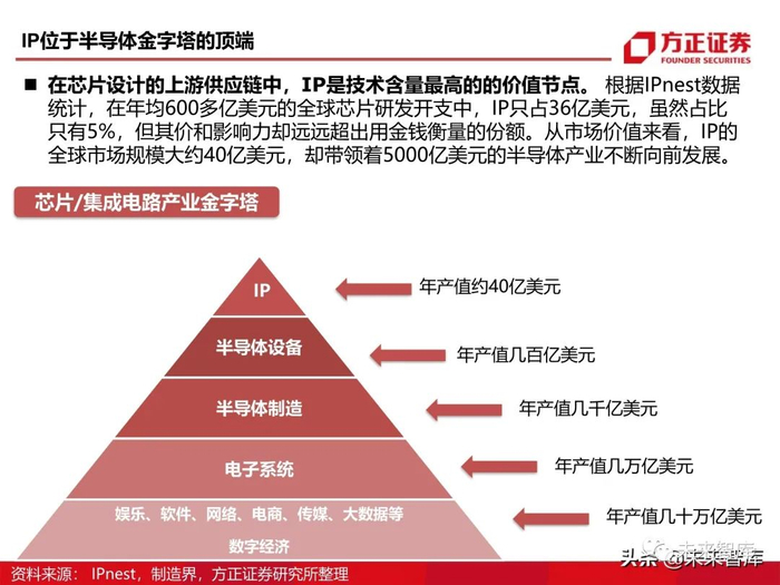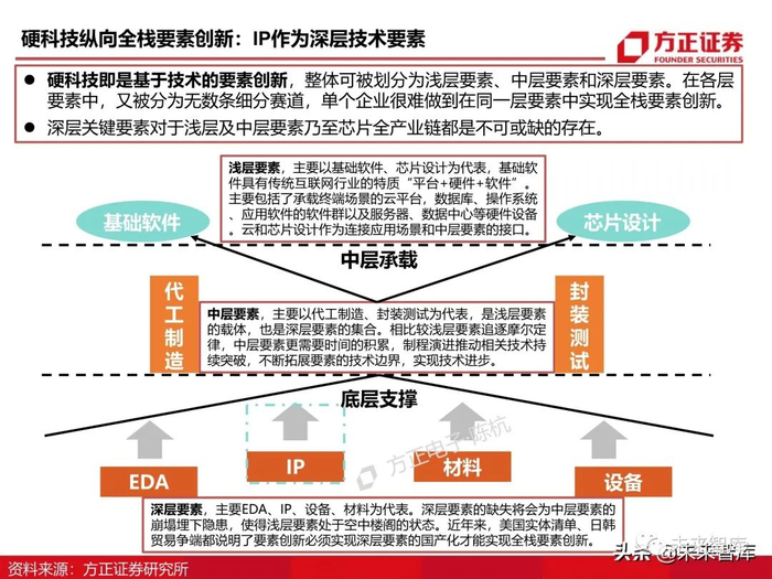 IP:硬科技创新的深层要素。IC设计产业的发展离不开其上游生态链的支持,而IP正是集成 电路设计产业链的上游关键环节。作为上游的上游,IP成为硬科技创新的深层要素。