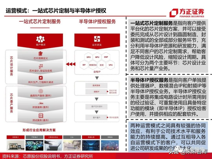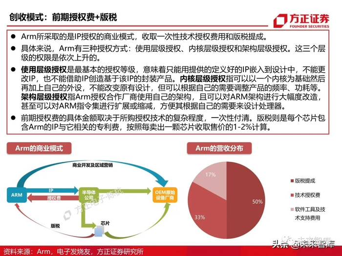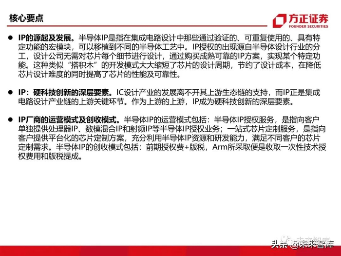 IP厂商的运营模式及创收模式。半导体IP的运营模式包括:半导体IP授权服务,是指向客户 单独提供处理器IP、数模混合IP和射频IP等半导体IP授权业务;一站式芯片定制服务,是指向 客户提供平台化的芯片定制方案,充分利用半导体IP资源和研发能力,满足不同客户的芯片 定制需求。半导体IP的创收模式包括:前期授权费+版税,Arm所采取便是收取一次性技术授 权费用和版税提成。