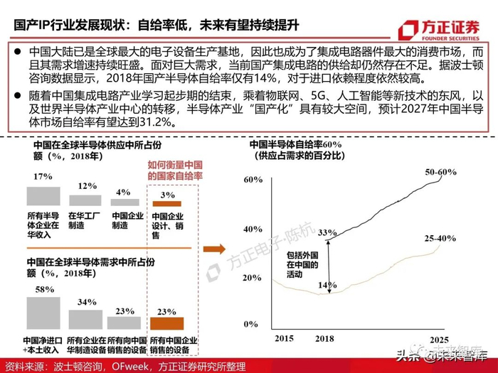 国产IP当前发展现状。中国大陆已是全球最大的电子设备生产基地,因此也成为了集成电路器 件最大的消费市场,而且其需求增速持续旺盛。面对巨大需求,当前国产集成电路的供给严重 不足。据波士顿咨询数据显示,2018年国产半导体自给率仅有14%,对于进口依赖程度依然 较高。前十大IP厂商中仅排名第7的芯原股份为大陆厂商,市占率仅为1.8%。IP国产化需求迫 切。