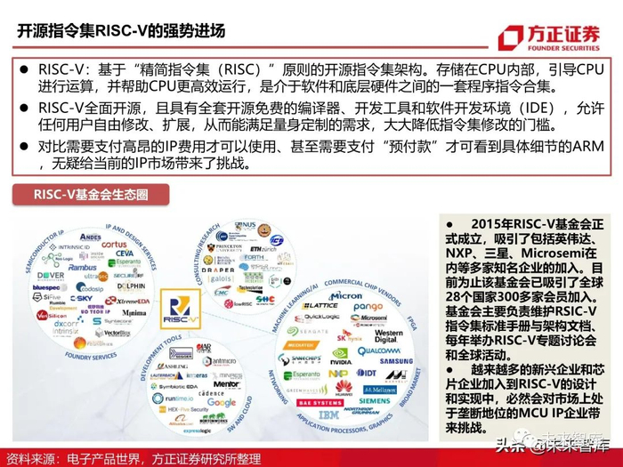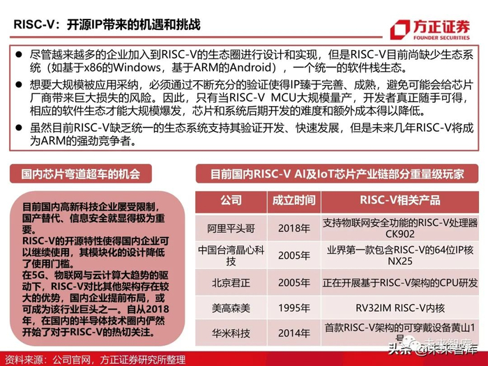RISC-V:IP发展新际遇。RISC-V全面开源,且具有全套开源免费的编译器、开发工具和软 件开发环境(IDE),允许任何用户自由修改、扩展,从而能满足量身定制的需求,大大降低 指令集修改的门槛。随着物联网时代的来临,RISC-V作为新兴架构,以其精简的体量,或许 在未来的IoT领域中能取得一定的优势。