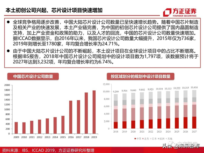国产IP市场空间与发展潜力分析。全球竞争格局逐步改善,中国大陆芯片设计公司数量已呈快 速增长趋势。据ICCAD数据显示,自2016年以来,我国芯片设计公司数量大幅提升,2015年 仅为736家,2019年则增长至1780家,年均复合增长率为24.71%。由于中国大陆芯片设计公 司的不断崛起,本土设计项目在全球设计项目中的占比不断增高。乘着物联网、5G、人工智 能等新技术的东风,以及世界半导体产业中心的转移,半导体产业“国产化”具有较大空间, 预计2027年中国半导体市场自给率有望达到31.2%。