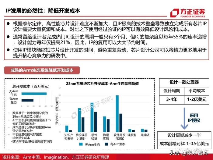 IP的源起及发展。半导体IP是指在集成电路设计中那些通过验证的、可重复使用的、具有特 定功能的宏模块,可以移植到不同的半导体工艺中。IP授权的出现源自半导体设计行业的分 工,设计公司无需对芯片每个细节进行设计,通过购买成熟可靠的IP方案,实现某个特定功 能。这种类似“搭积木”的开发模式大大缩短了芯片的设计周期,节约了设计成本,在降低 芯片设计难度的同时提高了芯片的性能及可靠性。