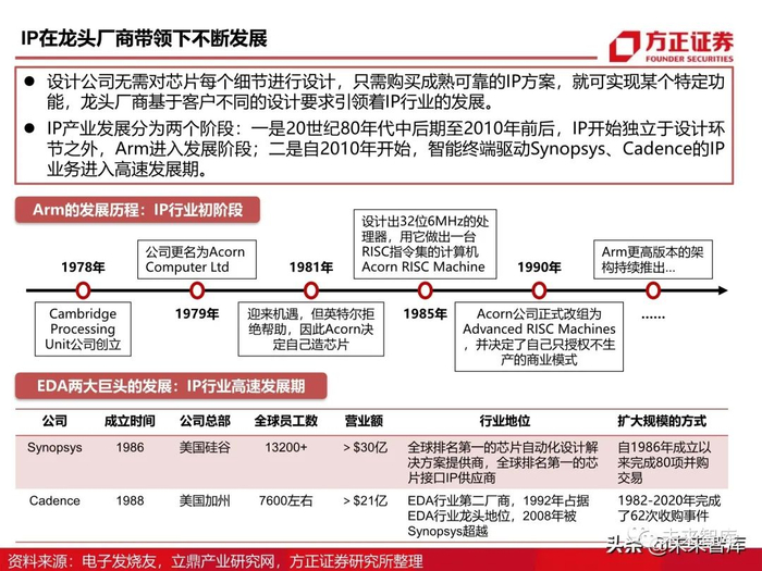 二、客户网络效应所建立的上下游生态体系。IP公司之间的竞争,除了各家技术上的独特性,更多还要看建立 生态的能力,Arm能够成为移动时代王者的核心因素,除了CPU和GPU架构等核心IP,还在于联合合作伙伴建 立了IP-芯片-应用的一体化生态,从而形成了高壁垒。Arm仅是去年签署的授权许可协议就达到1767份,近五 年客户累计超过450个,包括IBM、高通、英伟达、微软、苹果等全球知名公司,这为其搭建完善的生态系统供 应链提供了基础。我国的半导体IP份额比重较低,IP公司之间的竞争除了各家技术上的独特性,更为重要的是 能否建立起一种生态的能力。