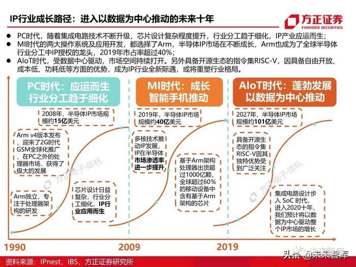 PC时代,随着集成电路技术不断升级,芯片设计复杂程度提升,行业分工趋于细化,IP产业应运而生;