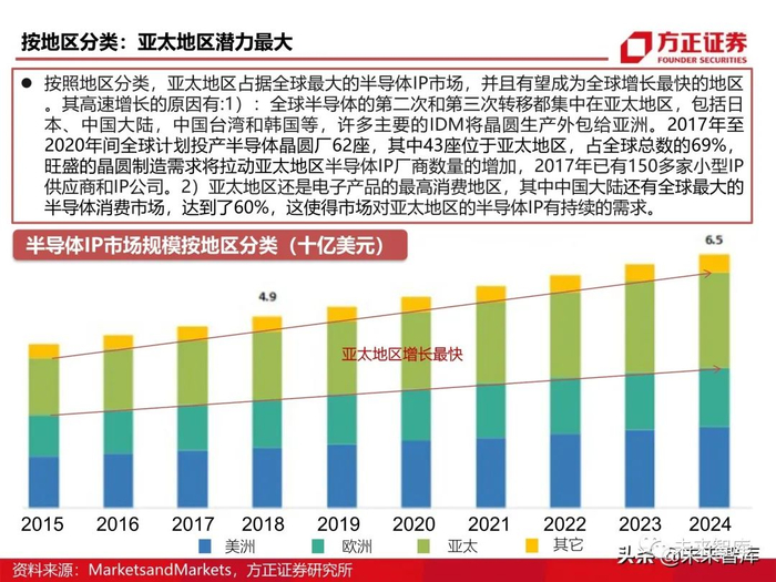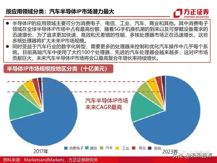 IP全球市场格局及细分市场龙头。按产品分类,IP可以大致分为处理器IP、有线接口IP、物理 IP和数字IP四大类。其中处理器IP是目前全球最大的IP族群,市占率超过50%,代表性龙头主 要有Arm、imagination、CEVA;接口IP发展潜力最大,代表性龙头主要有新思科技和铿腾 电子。按地区分类,亚太地区占据全球最大的半导体IP市场,并且有望成为全球增长最快的 地区。按应用分类,主要可分为消费电子、电信、工业、汽车、商业和其他,其中消费电子 领域在全球半导体IP市场中占有最高份额,展望未来汽车领域增速最快。