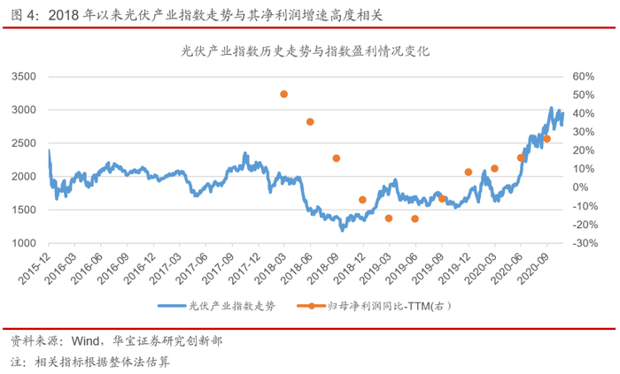 对比光伏产业指数走势与其净利润增速变动可以发现,2018年以来光伏产业指数的涨跌与其涨跌高度相关,2019三季度以来光伏产业指数归母净利润增速(TTM)指标不断改善,同期指数也开始触底回升,进入上行通道。根据分析师一致预测数据,2020年光伏产业指数一致预期净利润(中位数)的同比增速为35.94%,2021年光伏产业指数一致预期净利润(中位数)的同比增速为27.08%,长期来看光伏产业指数成分股盈利的持续正增长将为指数提供上行动力。