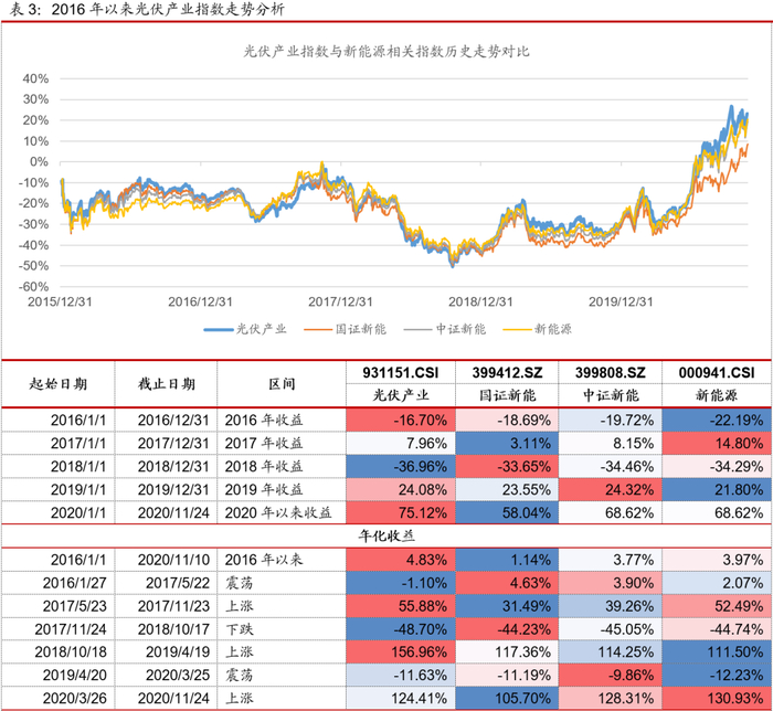 如前所述,2020年4月国家能源局发布《关于做好可再生能源发展“十四五”规划编制工作有关的事项的通知》,提出了2030年非化石能源消费占比20%的战略目标,在这一进程中光伏产业有巨大发展空间。光伏产业指数汇聚光伏产业链上中下游代表性龙头企业,是布局光伏产业的有效投资工具,后续伴随光伏平价上网的推进,光伏行业有望迎来新的发现机遇,这也将为光伏指数继续上涨提供空间。从历史表现来看,光伏产业指数的波动高于新能源产业指数,交易属性更强,且指数在上涨行情中的收益领先新能源主题指数,能较好的把握新能源领域的投资机遇。