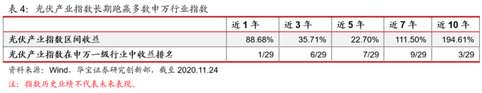 截至2020年10月底,光伏产业指数前十大重仓股合计权重69.84%,指数持股高度集中,重仓股对于光伏产业上游晶体硅材料、中游硅片、电池片、组件和下游逆变器、光伏电站均有覆盖。