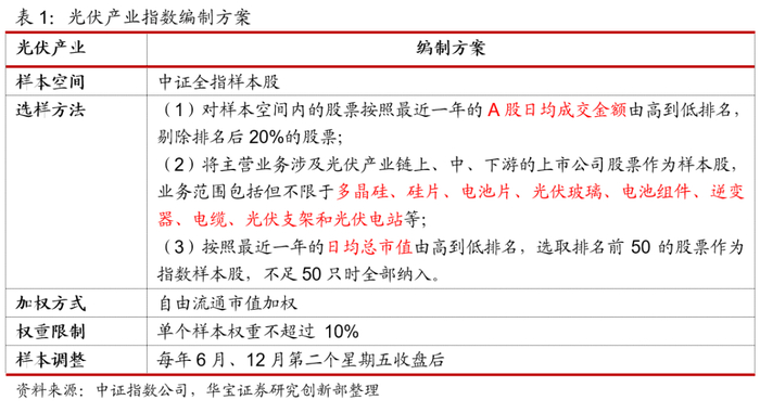 中证光伏产业指数(简称:光伏产业,代码:931151.CSI)将主营业务涉及光伏产业链上、中、下游的上市公司股票作为待选样本,选取不超过50家最具代表性公司作为样本股,反映光伏产业公司的整体表现,具体编制方案如下表所示: