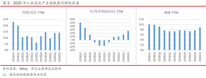 根据光伏产业指数当前成分股名单测算其历史盈利数据,可以看到:营业收入方面2020年一季度受疫情影响光伏产业指数营收同比增速虽然下滑,但仍然为正,二季度伴随复工复产的持续推荐,光伏产业指数营收同比(TTM)迅速回升至13.96%,三季度指数营收同比(TTM)进一步上升至14.29%;净利润方面,2019年三季度开始,光伏产业指数归母净利润(TTM)开始触底回升,至2019年四季度净利润(TTM)同比增速转正,且2020年前三季度增速不断提升,至2020年三季度光伏指数归母净利润(TTM)同比增速回升至26.32%;从净资产收益率指标来看,2018年以来光伏指数ROE始终保持在6%以上,2020年以来光伏产业指数ROE不断抬升,截至2020年9月底,其ROE-TTM为8.88%。