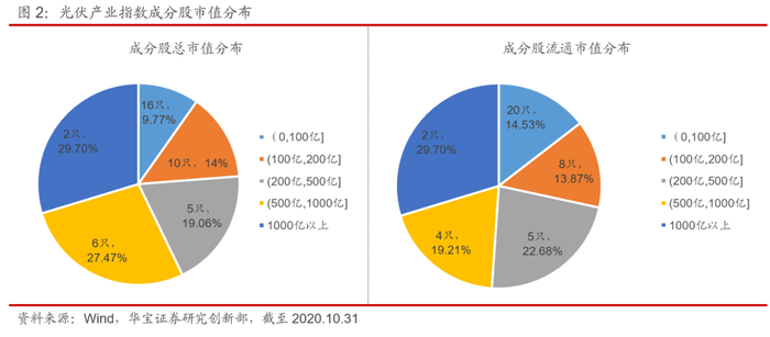 截至2020年10月底,光伏产业指数成分股共计39只,合计A股总市值11787.59亿元,流通市值10360.51亿元,自由流通市值6441.90亿元。