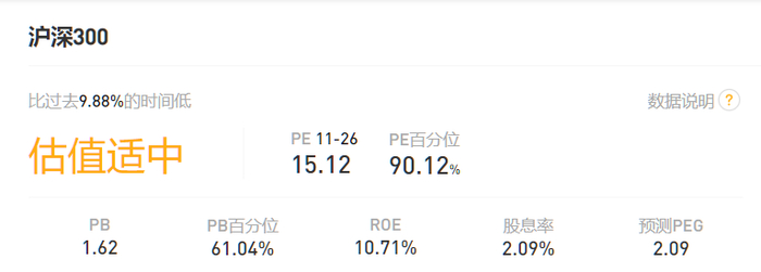 虽然沪深300的市净率高于历史上75%的时期,但数值没有超过20,同时,市净率也不算高,因此蛋卷基金给予了“适中”的评价。