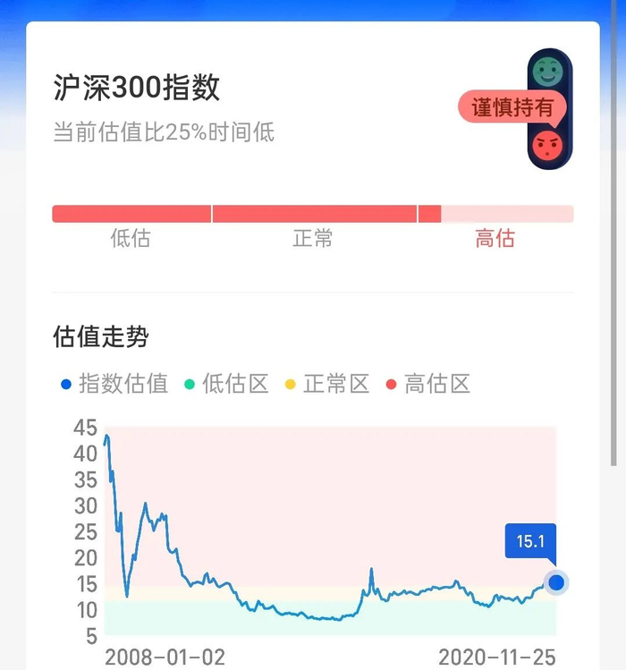 指数的市盈率,便是这个指数所代表的所有公司的总体市盈率情况。目前沪深300指数的PE是15.1,只比历史上25%的时间低,所以支付宝的指数红绿灯据此判断“高估”。