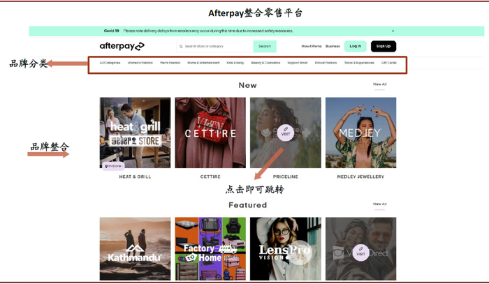 ►Afterpay与商户进行共同营销、构建整合零售平台,与商户共同成长实现共赢的合作关系。Afterpay在自身网站整合商户平台,并重新按照用户消费观念重新分类,逐步成为一个连接零售商和年轻购物者的新网络。Afterpay的目标是让客户更容易找到品牌和商店,而不是直接通过其网站完成付款。消费者通过官方网站的商户图标即可链接到商户自身的线上网站,然后通过Afterpay进行支付,为商户引流的同时亦通过合作品牌的品牌效应为自身进行营销,宣传Afterpay“先买后付”的消费观念。