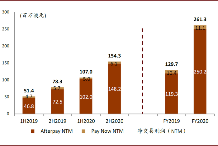 图表: 2020财年Afterpay总体NTM上升至2.6亿澳元