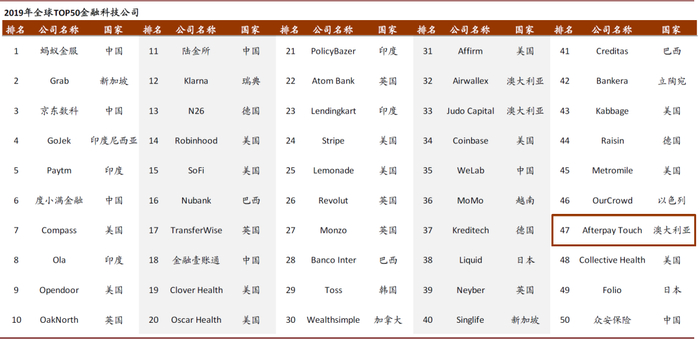 图表: Afterpay在2019年KPMG与H2 Ventures共同发布的全球金融科技公司50强榜单中位列47位