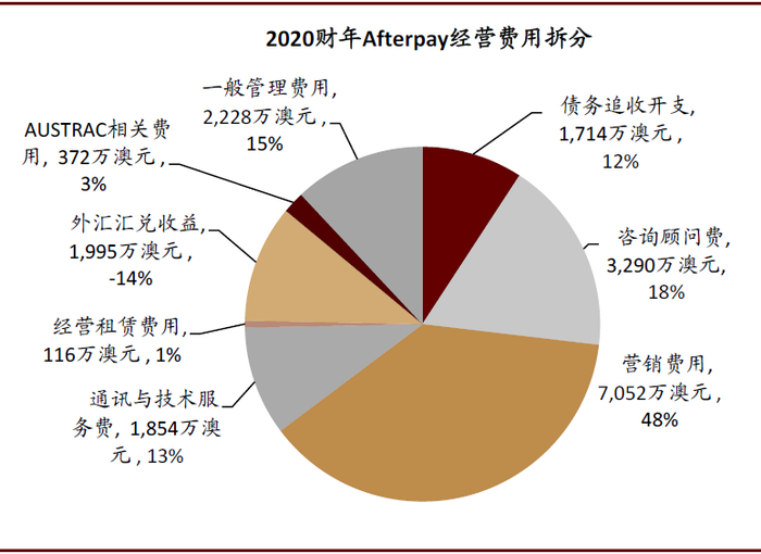 Afterpay营业成本中主要包含交易成本(包含网关费等)及SMS短信服务费等。2020财年Afterpay营业成本为1.34亿澳元(同比增长125%),主要因为各主要市场不断提升的交易量带动了营业成本中交易成本的增长,同时新开拓的美国及英国市场相较澳大利亚及新西兰市场的单笔交易成本更高。从毛利率的角度来看,2020财年Afterpay毛利率同比下降3.0ppt至74%,但Afterpay与VISA和Mastercard在2020年建立了全球战略合作关系,或有助于降低公司交易成本率。