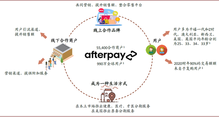 经过近5年的发展,Afterpay已经从最初的免息分期支付工具成长为一个广泛连接商家和消费者的生态网络。目前Afterpay平台已经拥有超过990万全球活跃用户,被超过55,400家商户所认可,在发展的同时也持续努力为商户及用户实现价值创造,Afterpay通过自身流量为商户带来销售额的提升,为消费者实现免息分期支付带来消费弹性。其自身平台亦通过品牌效应明显的商家宣传自身的支付方式,当用户在合作商户网站注册Afterpay账户开始购物时,这些合作商户原有的客户也会有很大一部分成为Afterpay的用户,驱动Afterpay平台快速发展,这种良好的互惠关系带来了良好的网络效应、实现了共赢的合作关系。