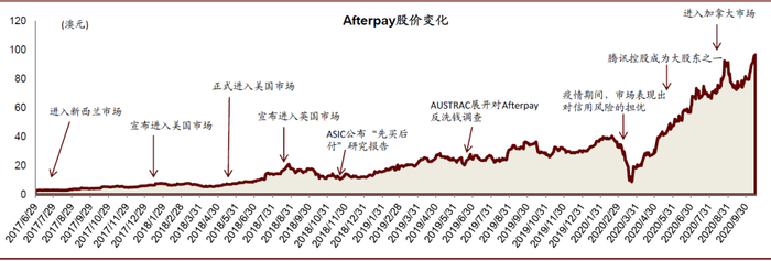 资料来源:Bloomberg,中金公司研究部;注:Afterpay股价为2017年6月29日至2020年10月16日期间收盘价