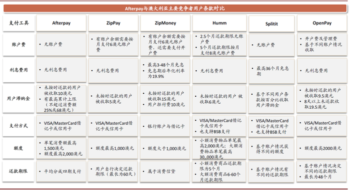 图表: Aftetpay与澳大利亚主要“先买后付”产品用户条款对比