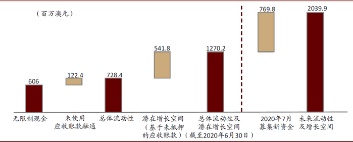 ►从可用资金流动性及潜在空间来看,公司财报披露未来潜在可用资金额~20亿澳元,可以支撑未来300亿澳元的新增交易额。其中,目前公司可用无限制现金及应收账款融通的总额为12.7亿澳元,2020年7月公司通过再融资(Share Purchase Plan)的方式募集资金7.9亿澳元,使未来公司整体可用资金达20亿澳元。整体来看,公司目前仅能通过上述方式获得有限的资金,如未来融资渠道受到影响,会对公司运营产生不利的影响。