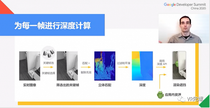 实时图像-形成关键帧池-筛选出关键帧-根据智能算法剔除无效关键帧-立体匹配-使关键帧平滑-调用深度API-实现渲染遮挡。