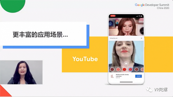 在YouTube中的应用。用户可以一边看美妆博主示范化妆方式,一边可以使用AR功能进行实时试妆。