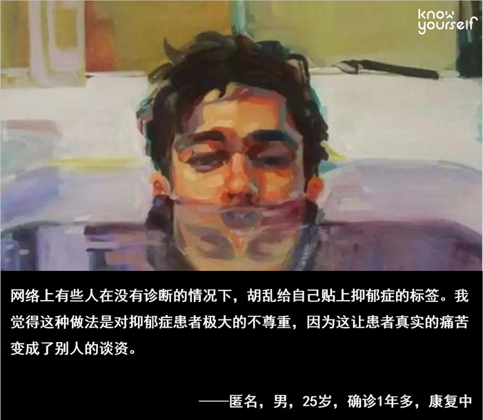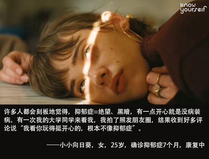 但是这种猎奇心态给真正的抑郁症患者带来了污名,人们会感到抑郁症“谁都说自己有”、“随处可见”、“太容易伪装”。遇到真正的抑郁症患者时,人们免不了也带着这样的揣测看ta们,抑郁症患者因此承担了不必要的误解和指责。