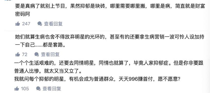 她提到自己病了在服药,最严重的时候,连从床走到房门口都做不到,但令人遗憾的是,有许多网友在评论中攻击她,认为她就是“作”、“矫情”、“情商低”……
