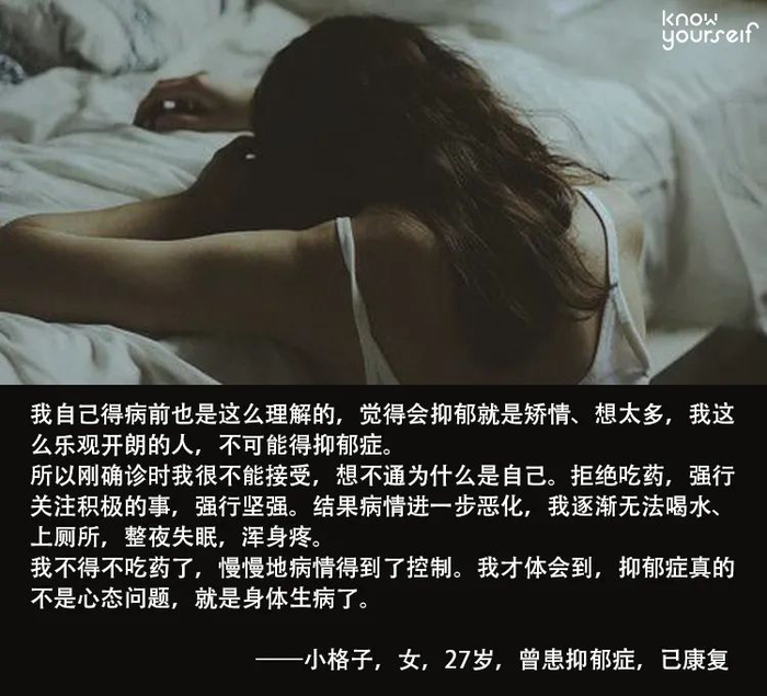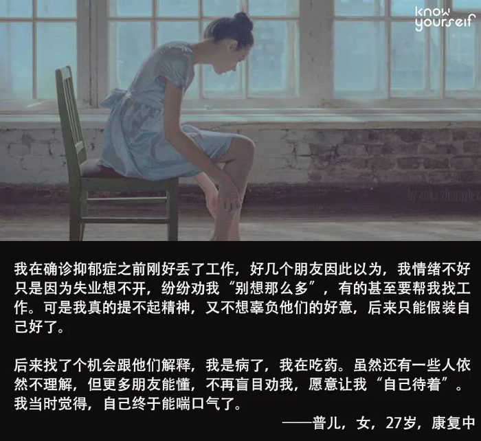 没有人应该因为患病遭到苛待。我希望,每个人每一次小小的包容、理解、接纳,都将最终为抑郁症患者营造更有关怀、支持的社会环境。