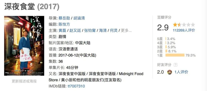 内地版《深夜食堂》电视剧的豆瓣得分只有2.9,与最近热议的新版《鹿鼎记》差不多是难兄难弟。