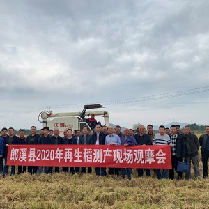 测产现场,田间的再生稻正处于黄熟期,稻粒金黄,粒粒饱满,一派丰收的景象。专家组实地考察了种植现场,随机选取了3块田进行机收,丈量实割面积,称取湿谷重量,测定含水量和杂质率,按籼稻含水量13.5%折算标粮产量,平均亩产459.2公斤,加上头季平均亩产600.6公斤,亩收1059.8公斤,实现“一种两收、亩产吨稻”,大大节约了种植户的生产成本,提高了经济效益。今年天气异常,再生稻种植中,头季长期阴雨寡照,再生季又遇低温冷害,很多品种均出现了不同程度的减产,而“丰两优香一号”因生育期适中、米质优、抗寒性好等特点,表现出了超强的丰产稳产性能,受到了领导和专家的一致好评,表示这是今年所看到的表现最好最优异的再生稻。据悉,郎溪再生稻种植户涂士银将自己生产的再生稻稻谷加工成大米,以每斤5元的价格通过网络对外出售,供不应求,产生了很好的经济效益。