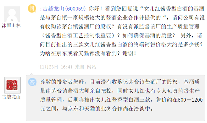 11月26日, 古越龙山 在互动平台表示,目前没有收购该茅台镇酱酒厂的股权,基酒质量由茅台镇酱酒大师亲自把控,同时女儿红也有专人负责监督生产质量管理,后期将推出女儿红酱香型白酒三款,售价约在500-1200元之间。