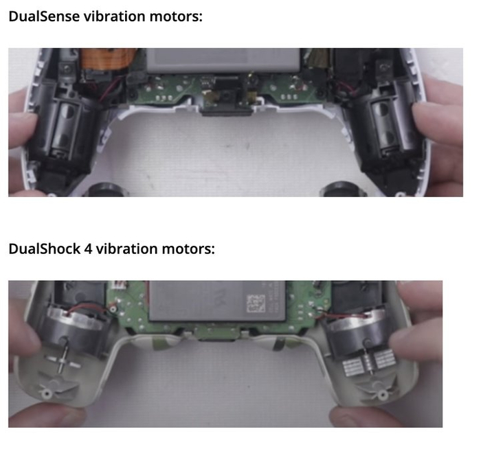▲ PS5 手柄采用了两颗全新的线性马达,以取代之前 PS4 手柄中的转子马达。体积更大,能够模拟出的震感也更加细腻。图片来自:TronicsFix