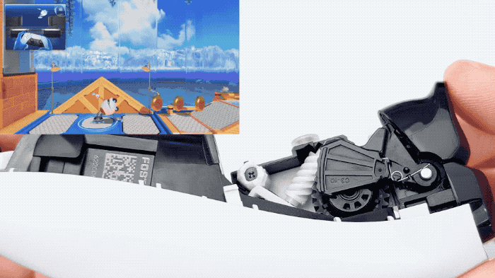 那么,PS5 手柄又做了哪些改进?从 Restore Technique 的拆解中我们得知,索尼在两个扳机键内部,各增加了一个由电机驱动的齿轮。不通电时,扳机键的按压和传统手柄类似,一旦电机通电,齿轮就会向扳机键施加特定的阻力,从而模拟出枪支的后坐力、弹簧的弹力,乃至是绳索的拉力等各种效果。
