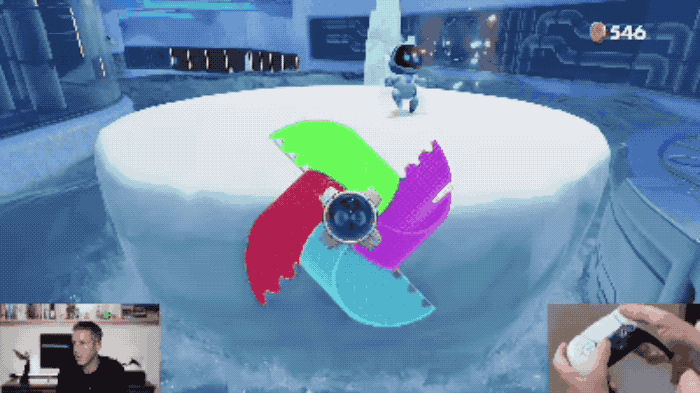 PS5 自带了一款游戏,名叫《Astro’s Playroom》,基本上是最能体现 PS5 手柄特点的游戏之一。因为游戏中所有的关卡、玩法设计,都在想方设法和新手柄的功能联系在一起。