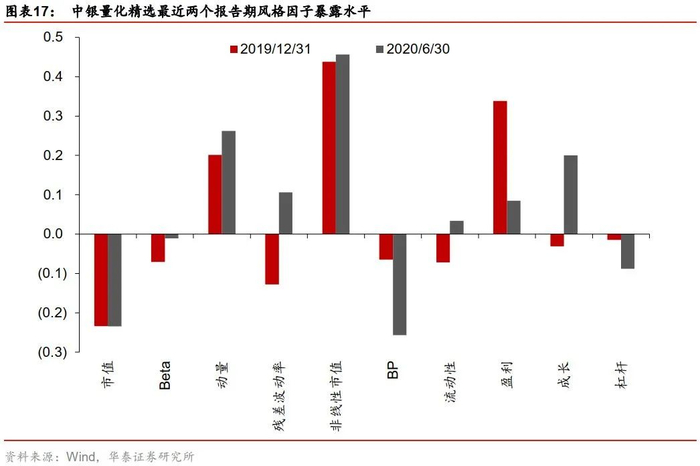 从结果上看,两只中银量化指数增强产品对风格暴露的控制均较为理想,组合风格呈现一定的稳定性。中银量化价值基金在残差波动率、动量、Beta和流动性等因子上超配,在市值、估值和杠杆因子上呈现低配;中银量化精选基金的风格暴露水平相对前者更高,在动量、非线性市值和盈利因子上超配,在市值和估值因子上呈现低配。