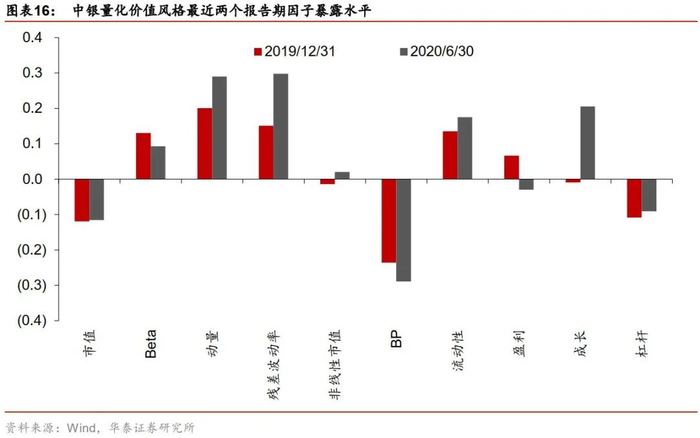 从整体来看,中银量化价值基金的风格暴露水平控制理想,近两个报告期的风格偏差均控制在±0.3个单位以内;同时,近两期的风格较为稳定,在市值、Beta、动量、价值等多个风格上均呈现较好的延续性,与2020年上半年的市场整体风格较为契合;同时,组合在成长风格上明显转为超配,并低配盈利因子,可以看出基金针对市场变化保持一定的动态调整。