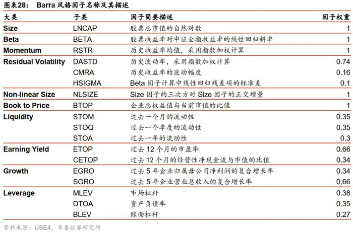 基础的Barra模型包含十个风格因子,其具体定义如下: