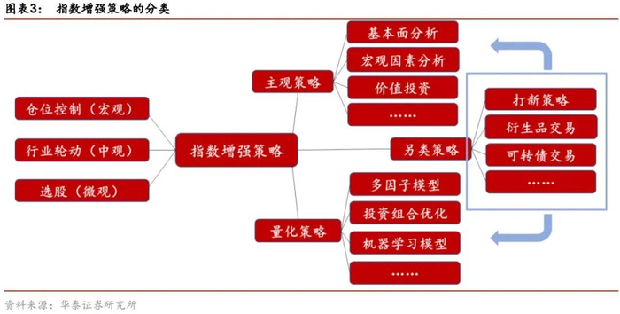 除了跟踪指数获得的Beta收益,指数增强基金的核心目标在于挖掘Alpha收益的增强策略。从市场的视角来看,指数增强策略一般可分为宏观的仓位控制、中观的行业轮动以及微观的选股策略;从应用的方法论以及投资工具角度来看,策略一般包含主动、量化两大策略以及提供并行增强效果的另类策略。其中,另类策略包含打新收益、股指期货基差交易策略、可转债投资策略以及衍生品交易等多元化的途径。