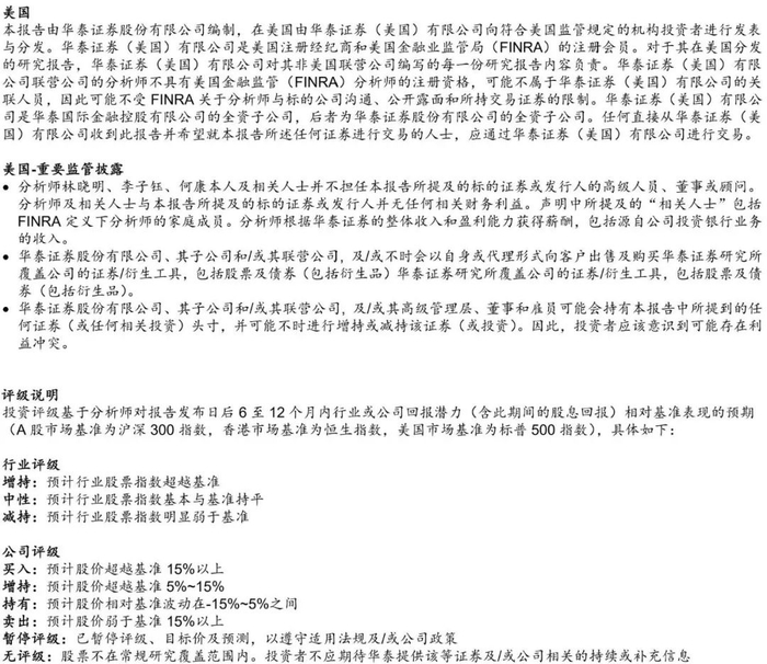 在任何情况下,本公众号中的信息或所表述的意见均不构成对任何人的投资建议。订阅者不应单独依靠本订阅号中的内容而取代自身独立的判断,应自主做出投资决策并自行承担投资风险。订阅者若使用本资料,有可能会因缺乏解读服务而对内容产生理解上的歧义,进而造成投资损失。对依据或者使用本公众号内容所造成的一切后果,华泰证券及作者均不承担任何法律责任。