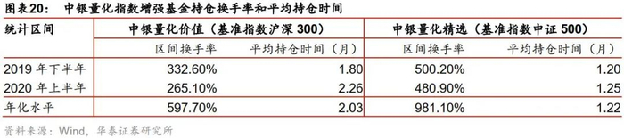 值得注意的是,Brinson模型假定资产组合的持仓透明,且在观测期内保持稳定;在实际应用中,主动型基金的完整持仓信息仅在半年报和年报披露,其余区间的变动难以探知。为提高准确性,我们统计了两只产品在切换至指数增强策略后的持仓换手率和平均持仓时间情况,以对统计区间时长提供参考。