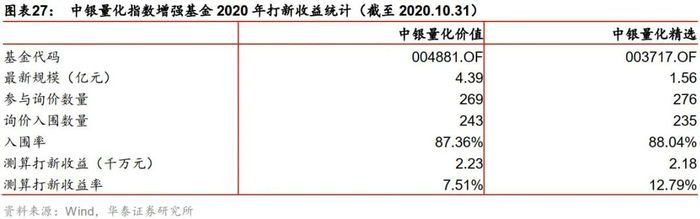对于以实际收益增强为目的的打新策略,控制基金账户规模是相对关键的因素。一方面,沪市的科创板和创业板均为当前打新的热门板块,基金持仓需要在两市均保持一定的底仓;另一方面,相对偏小的基金规模有助于缓解收益稀释效应,在打新收益率上更有优势。以中银量化指数增强基金为例,中银量化价值基金2020年三季度规模为4.39亿元,今年以来平滑规模2.97亿元;中银量化精选基金2020年三季度规模为1.56亿元,平滑规模1.70亿元。整体来看,两只指数增强基金规模均控制在5亿元以内,处于打新策略收益增强相对理想的区间。