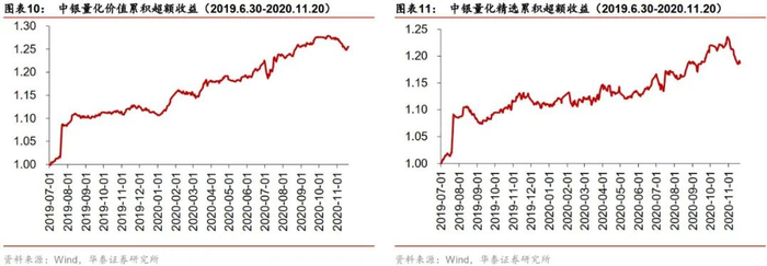 从净值曲线可以看到,两只指数增强产品在净值水平上长期跑赢基准指数,呈现明显的超额收益;累积超额收益走势图进一步显示,两只产品的累积超额收益曲线均拥有较明显的正斜率。值得一提的是,以2019年7月中旬为例,累积超额收益曲线在部分区间内出现大幅上跳,推测主要源于大规模IPO项目贡献的打新收益。