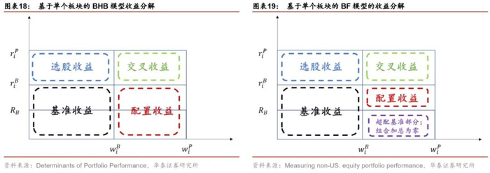 相比之下,更早之前由Brinson和Fachler(1985)提出的BF模型着重强调了基准指数的收益因素。从结果上看,BF模型将内部板块相对指数的超额收益代替板块绝对收益,强调了超额收益的意义。若站在组合全局的角度上看,BF模型右下角部分的加总为0,并不会产生实际影响;但在针对板块分析的时候,板块的溢价有更强的诠释意义。因此在下文中,我们采用BF模型对业绩进行分析。